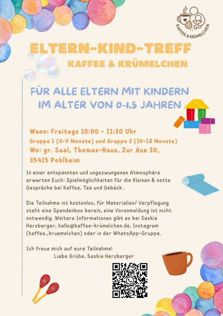 Wöchentlicher liebevoller Treffpunkt zum Austauschen, Kontakte knüpfen, mit wechselnden Spielmaterialien und alles bei Kaffee, Tee und Gebäck.